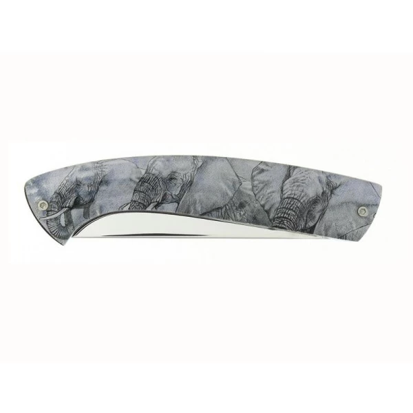 - Couteau « 1515 » ALSAC, lame poli glace acier 12C27 à cran intérieur, manche 12 cm motif éléphant, étui cuir.