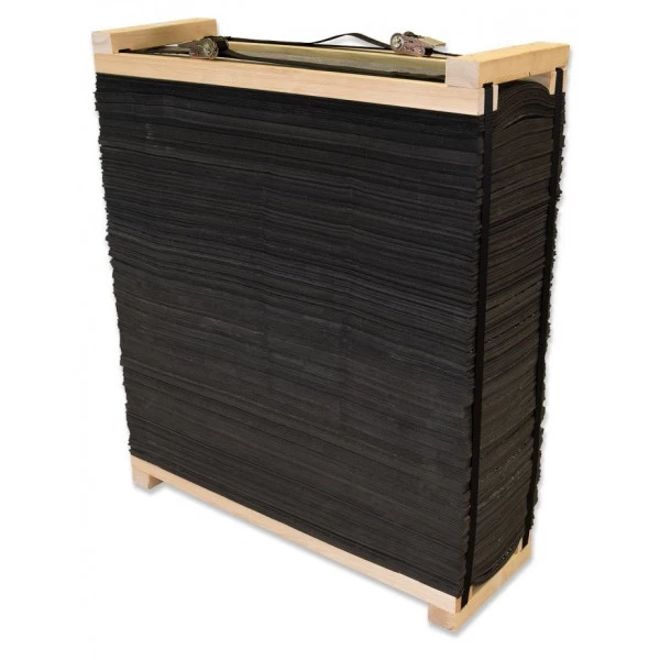 - Cible formée par un empilage de bandes de mousse dans un cadre en bois et serrée par sangle à cliquet