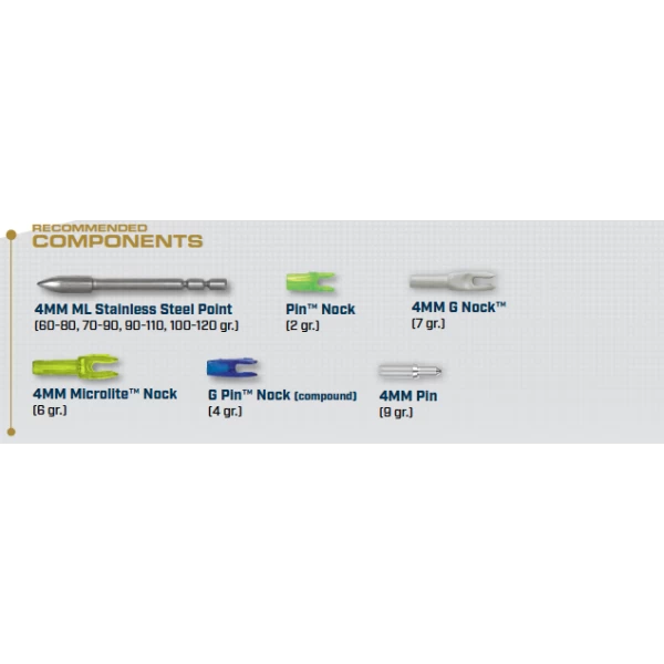 GPI | OD (in) | Longueur (in) | POINTE 4 mm ML | PIN | NOCK COLLAR | |||