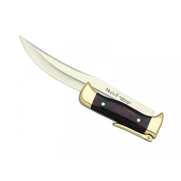 - Poignard pliant MUELA, lame acier inox X50CrMoV15, manche plaquettes stamina (ouverture et fermeture commandées par le levier), étui cuir.