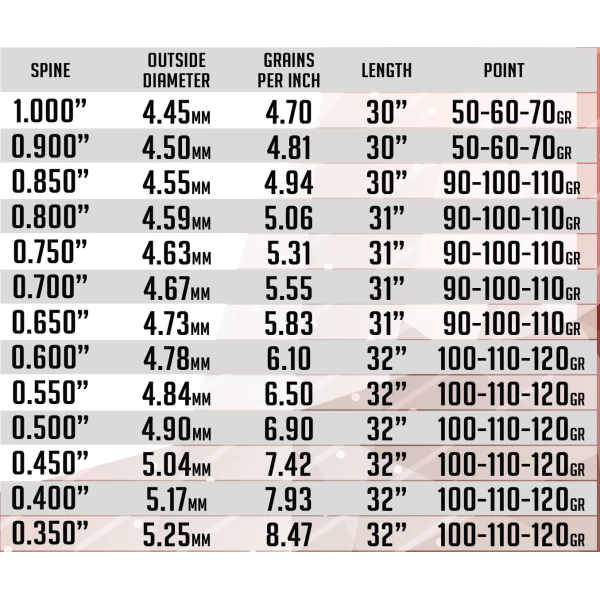 | SPINE | OUTSIDE DIAMETER | GRAIN PER INCH | LENGTH | RECOMMENDED POINT |
